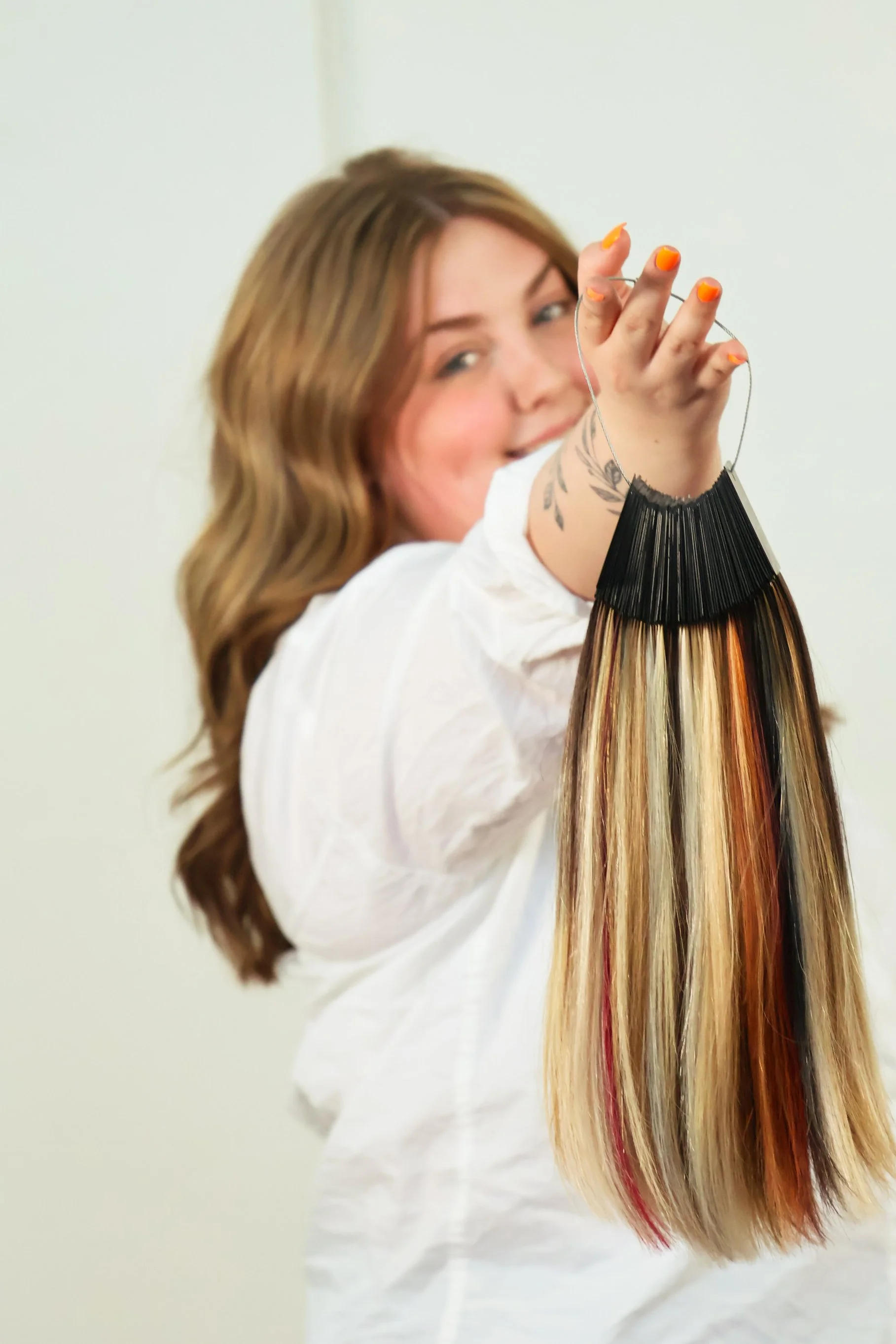 K-Tip extensions are individual hair strands pre-bonded with a keratin tip, applied to your natural hair using a heat fusion technique. This creates a secure and nearly invisible bond, allowing for a free-flowing, natural appearance. These extensions are fully customizable by length, color, and placement, making them ideal for precision blending and seamless results—even for those who have been told their hair is "too thin" for extensions.